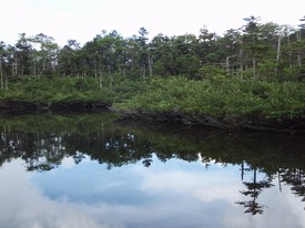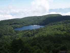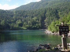 ■高見石より望む白駒池はコケが美しいそうです/小さな祠の祭られた丸山(2329m)の頂上