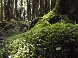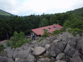 ■コケ類の美しい樹林帯を下ると赤い屋根の麦草ヒュッテが見えてきました。