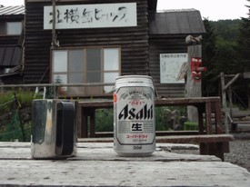 今宵の宿、北横岳ヒュッテへ荷物を置くとビールを買い持参したツマミと焼酎で一人カンパイです!