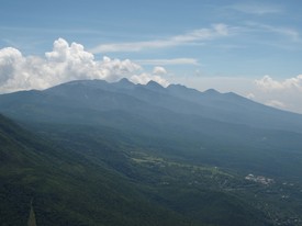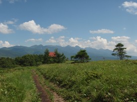 明日登る、霧ヶ峰の車山(1925m)が見えています(右画像最奥の山)